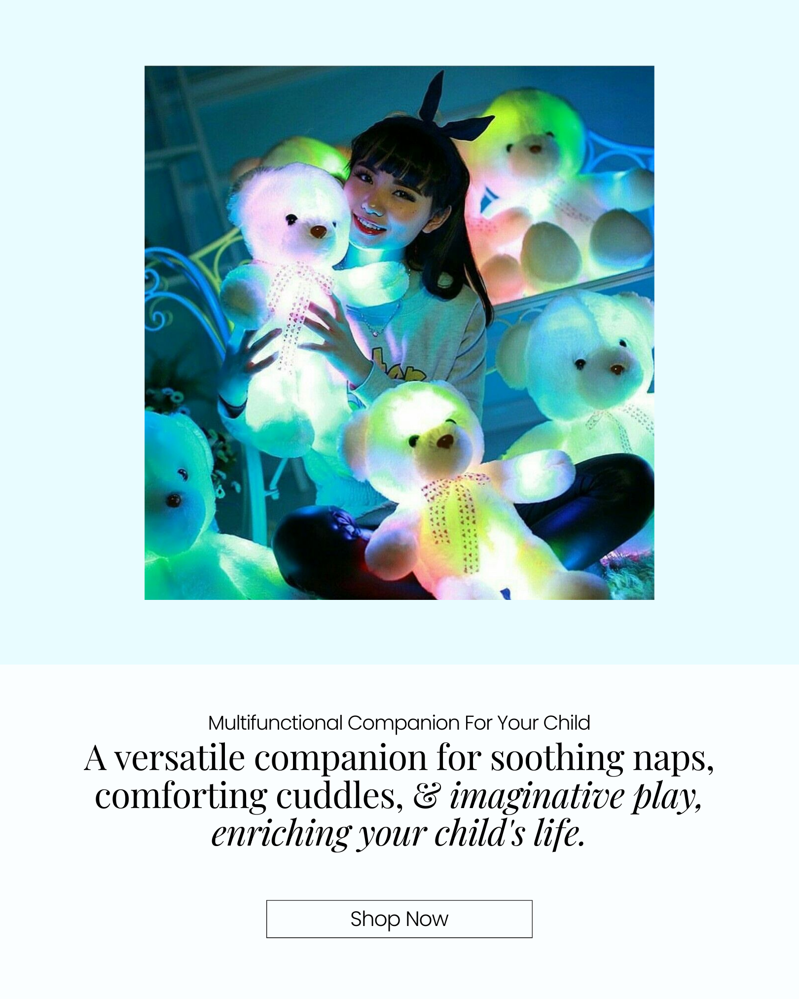 Engineered with advanced technology and designed for utmost comfort, Glow Teddy creates a serene sleep sanctuary for your child, easing them into a deep, rejuvenating slumber.