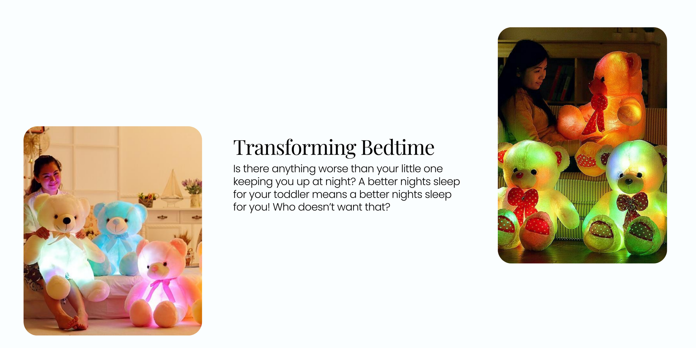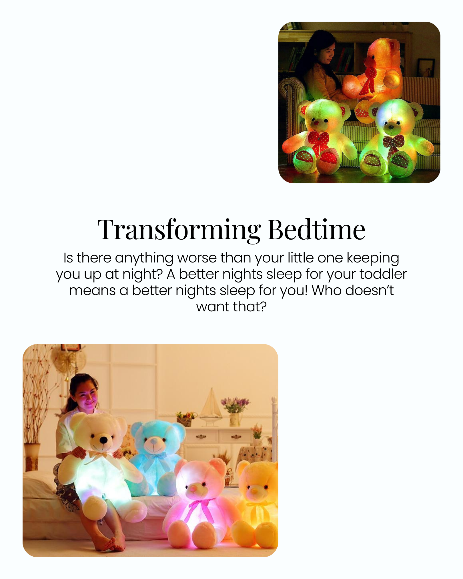 Kids afraid of the dark? Not anymore. Glow Teddy™ shines beautifully throughout the night providing children with all the love and tranquility they would ever need.